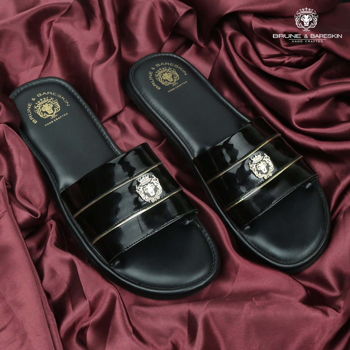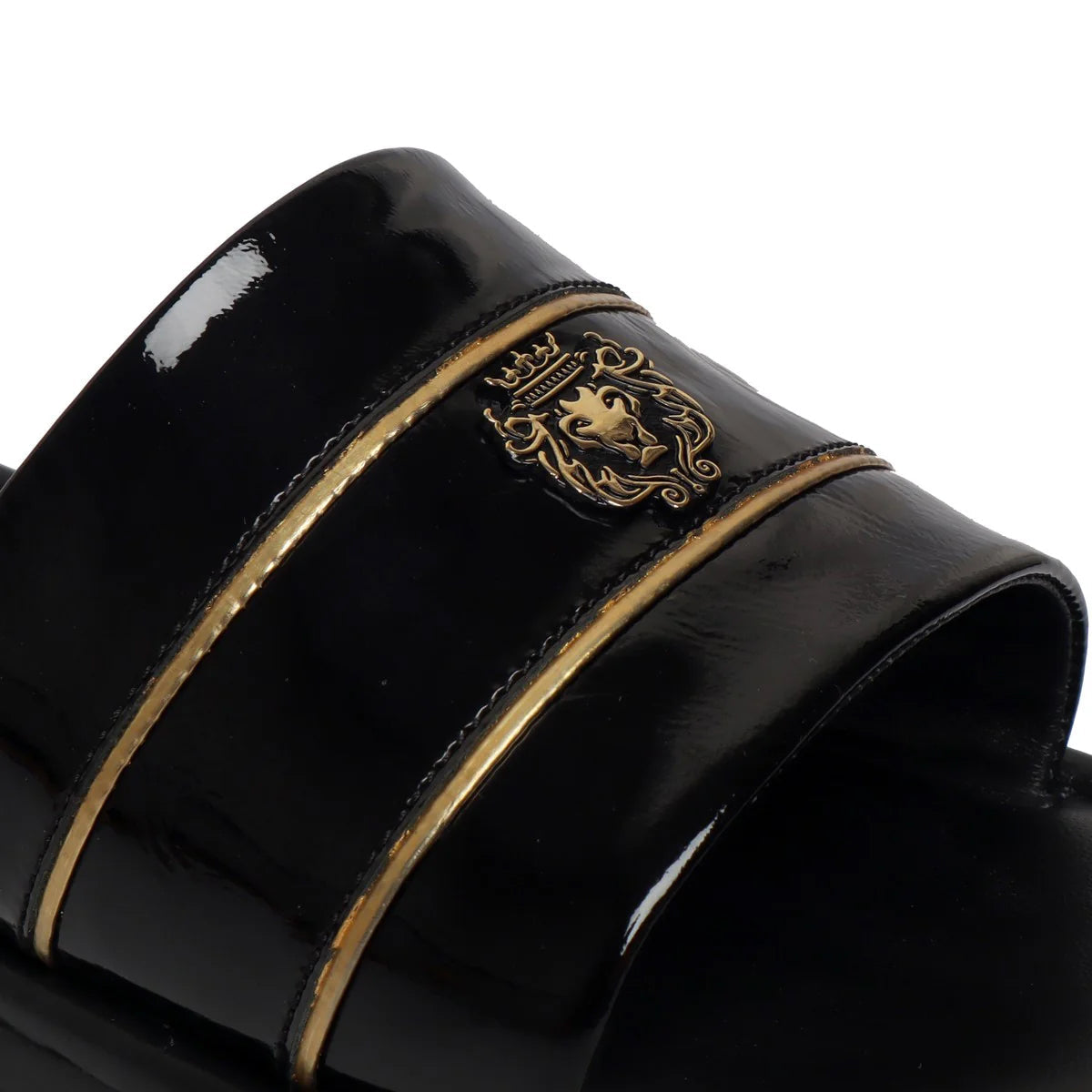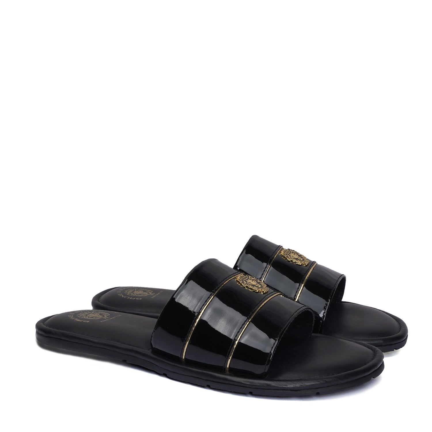 Black Patent Leather Slide-In-Slippers with Signature Metal Lion