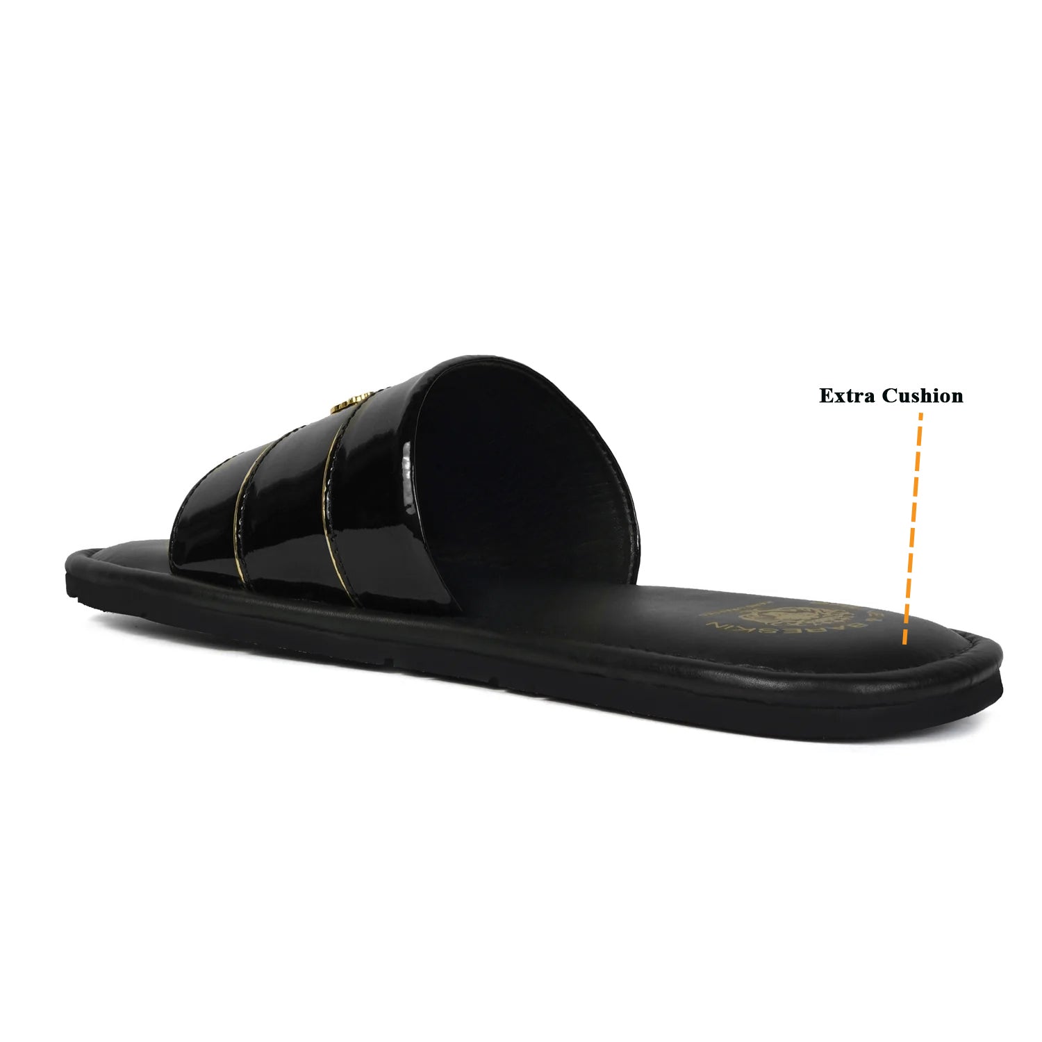 The metal lion logo on the Black patent leather strap makes these slippers a perfect choice. The Golden stripes on Black color uplifting its elegance. These slide slippers build especially for the folks who like to stay in style always. Experience the utmost comfort while walking with gel Injected extra cushioned memory foam. Just slide in your feet and feels the utmost comfort with vogue. Club these slides of Black Golden Collection with Jeans, Shorts, and other casual wear to complete your look. A high-quality sole makes it more durable with a whole day-long wear.