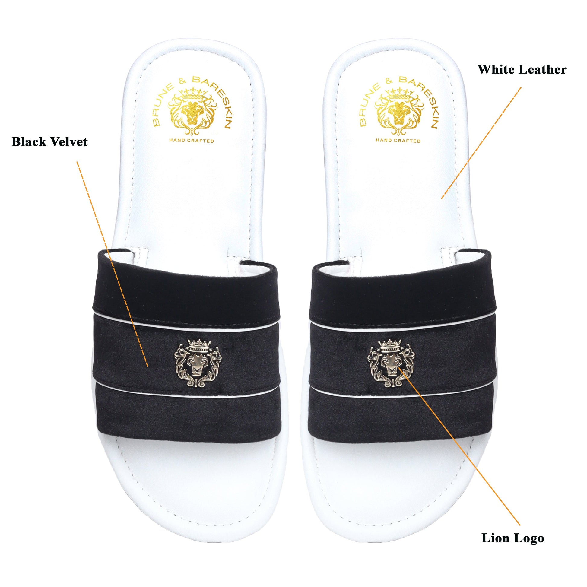 The black Italian Velvet strap on a white genuine leather base looks chic and feels cozy. This super-soft leather base slipper is a must-have of the season. The gel injected memory foam base is designed to provide you comfort while walking. We use special layering techniques to keep the base cozy and retain its shape. The velvet strap enhances the elegance further. Carry these with Jeans, Shorts, Capris, and other casual wear to be a style leaders. Anti-Skid Rubber outer sole ensures the perfect walking grip.