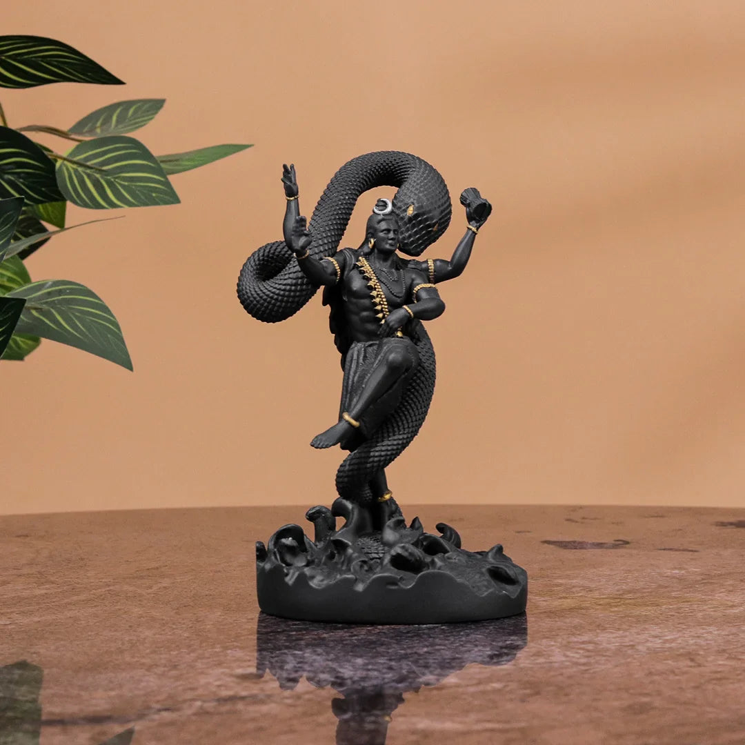 Presenting the Mystical Shiva figurine in an exquisite black variant, adorned with intricate golden colour ornaments that elevate its divine presence. Standing gracefully at 6 inches tall, this finely crafted masterpiece showcases Lord Shiva in a celestial pose, embodying the eternal dance of creation and destruction.