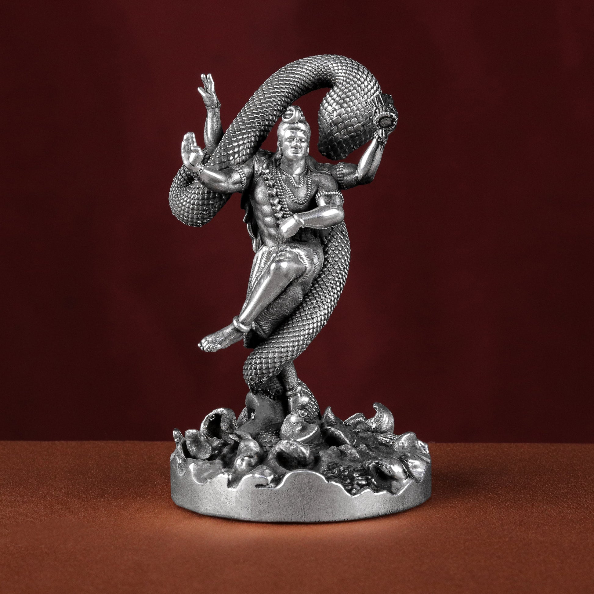 Introducing the Mystical Shiva, a stunning masterpiece made entirely of pure silver. This exquisite figurine embodies the divine essence of Lord Shiva, portraying his eternal dance of creation and destruction with intricate detail and grace.